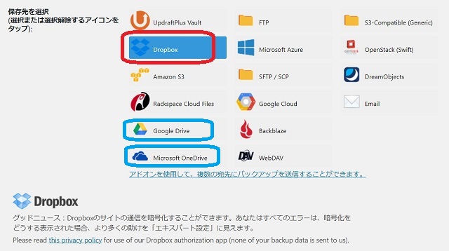 実は、UpdraftPlusをインストールする以前は「DropBox」の使用経験はなかったので、この機会に無料サービスレベルの「DropBox」アカウントを取得して保存先としました。