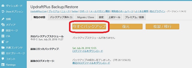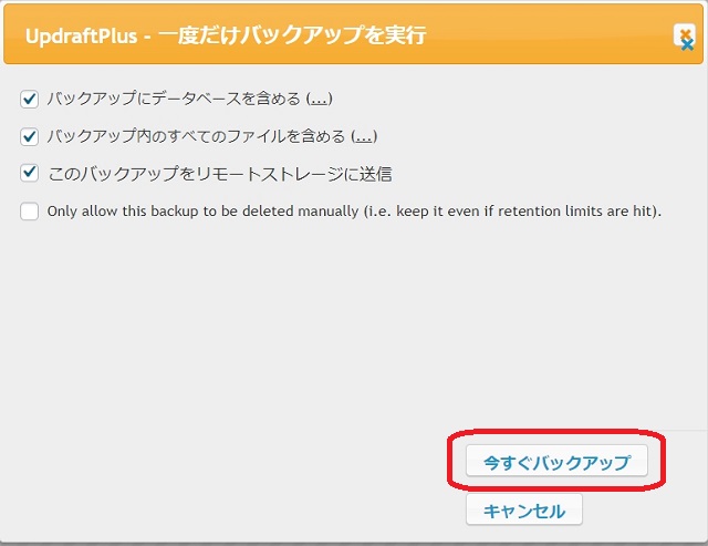 WordPress管理画面から設定→UpdraftPlusをクリックして、UpdraftPlusの管理画面から[現在の状態]→[今すぐバックアップ]→[一度だけバックアップを実行]画面で、[今すぐバックアップ]ボタンをクリックするとバックアップされます。