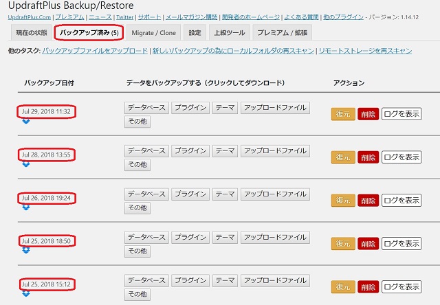 バックアップが完了したら、UpdraftPlusの管理画面の[バックアップ済]タブをクリックすると、バックアップされた状況の画面に遷移します。