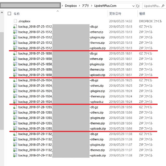 外部ストレージの「DropBox」のフォルダにも同様に5世代分のバックアップファイルが保存されている状況がみれます。